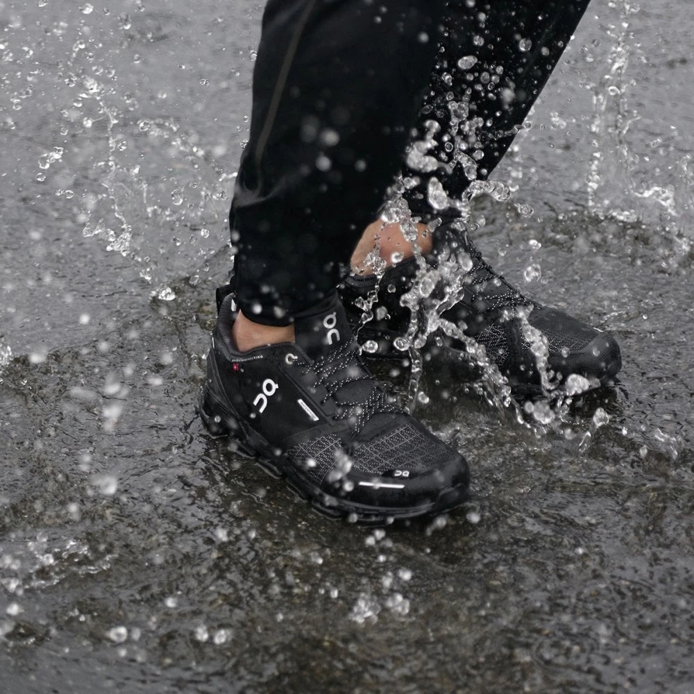 The On Cloudflyer Waterproof takes all the popular features of one of On’s flagship shoes, the Cloudflyer, with the iconic CloutTec cushioning, a fantastically light weight and lugs positioned to help prevent inward rolling (overpronation) and adds a waterproof upper.